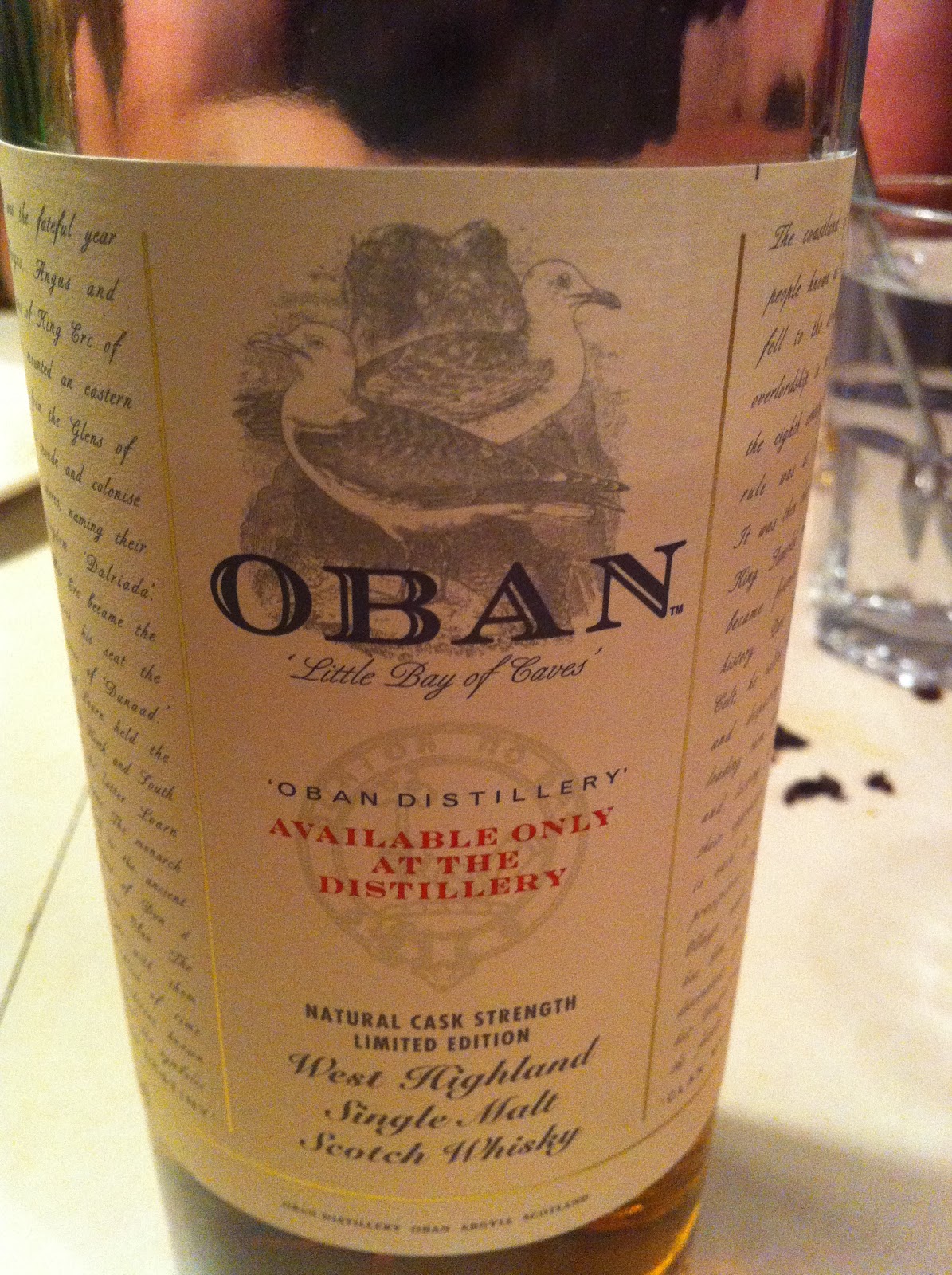 Unter uns: Für mich kann’s nicht oban genug sein! Es existieren meines Wissens leider nicht eben viele (deutlich zu wenige!) Abfüllungen dieser Brennerei, seit ein zwölfjähriger Oban vollkommen „single“ erstmals 1979 am Markt verfügbar war. Im Jahr 6 AD (Anno Diageo, Beginn unserer Zeitrechnung 1997), also 2003, ließen’s die neuen Herren richtig krachen und überrumpelten die Oban-Fanboys mit dem 6000 Flaschen starken bottling eines 32-jährigen „The Little Bay“-Whiskys. Nur ein Jahr später opferte man dem Gott des Konsums (und gerstenmälzerner Disposition) 1260 Flaschen – Royal Mile Whiskies weiß(?) von 1020 Stück – eines kräftigen („natural cask strength“) 20-Enders. Zwei ausgesuchte Verbrauchergruppen bedachte Diageo daraufhin 2008 (sowie 2011) mit einem 18 Jahre alten Single Malt: Brennereibesucher und den US-amerikanischen Markt – why, oh why? 2009 stand endlich unsere Manager-Bouteille zum Verkauf. Seitdem konnten Obanophile offiziell 2010 und 2013 zugreifen – ein NAS respektive ein 21yo aus der „Special Release“-Serie, zudem gibt es auch seit 1998 jährlich eine „Distillers Edition„, die in einem Fino-Fass (Montilla-Moriles, nicht Jerez) den zweiten Teil ihrer double maturation durchläuft. Anfang dieses Jahres dann der Oban „Oban“ (recte „Little Bay“), immens zeitgeistig ohne Altersangabe, dafür aber im Litergebinde.